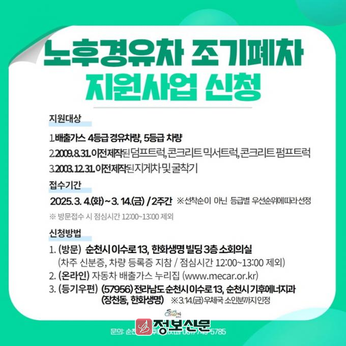 ![]() 순천시, 2025년 노후차 조기폐차 보조금 지원사업 추진 |