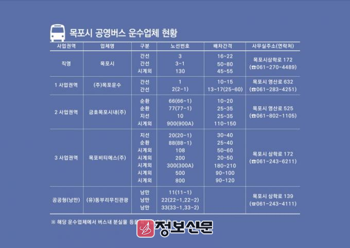 한편, 변경된 운행 시간 및 세부 노선 정보는 목포시청 누리집 방문 및 아래 전화번호로 문의하면 신속하게 안내받을 수 있다.