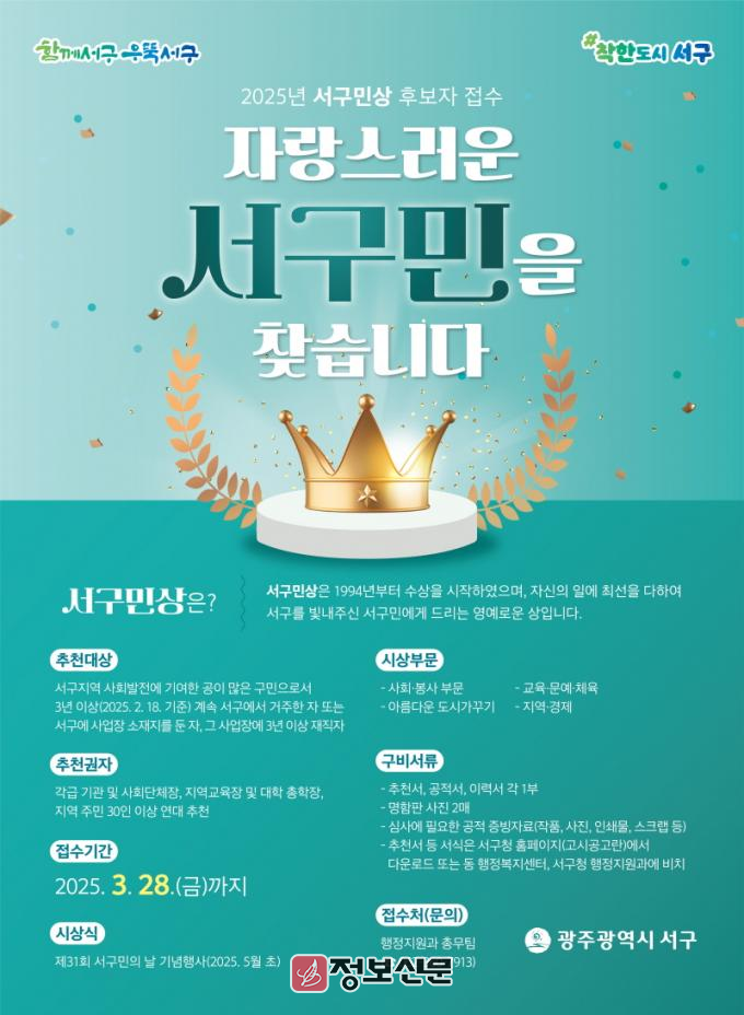 유광진 행정지원과장은 “서구민상은 보이지 않은 곳에서 지역사회 발전을 위해 오랫동안 묵묵히 헌신하고 계시는 마음 따뜻한 분께 드리는 영예로운 상인만큼 주민들의 많은 관심과 추천을 바란다”고 말했다.