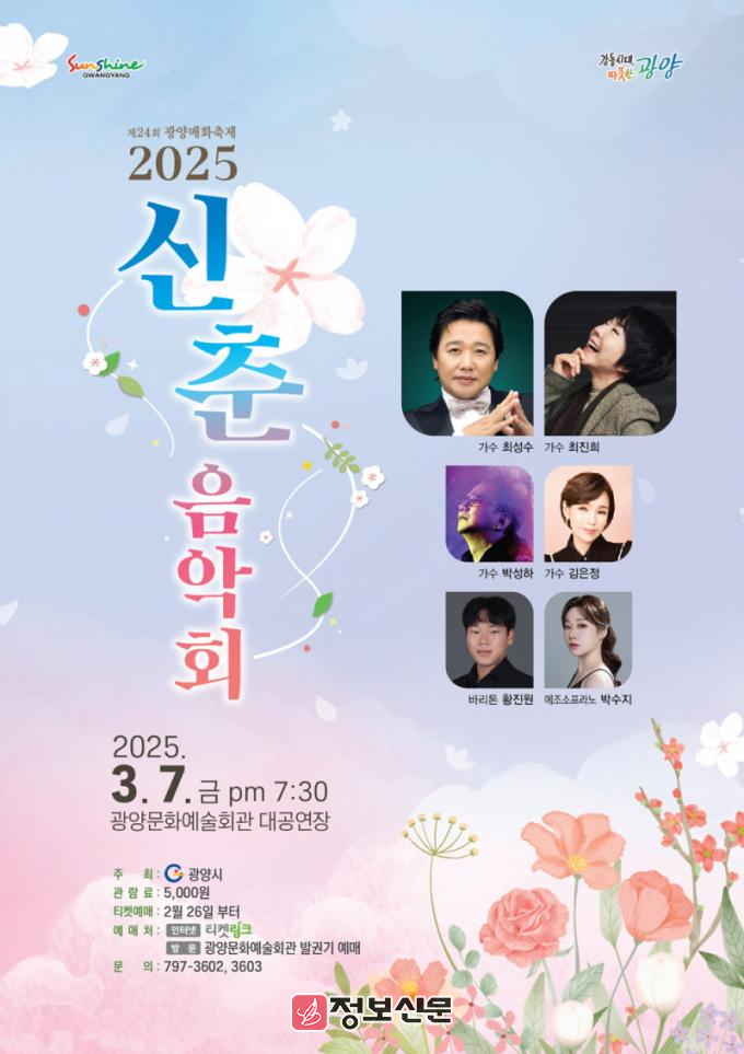공연은 전 좌석 5천 원이며, 온라인 예매는 2월 26일 오전 10시부터 티켓링크 https://www.ticketlink.co.kr)를 통해, 현장 예매는 광양문화예술회관에 방문해 예매할 수 있다. 기타 궁금한 사항은 문화예술과 문예회관팀(☎061-797-3602, 3603)으로 문의하면 된다.