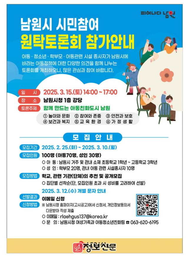 ![]() 남원시, 아동친화도시 조성을 위한 시민참여 원탁토론회 참가자 모집 |