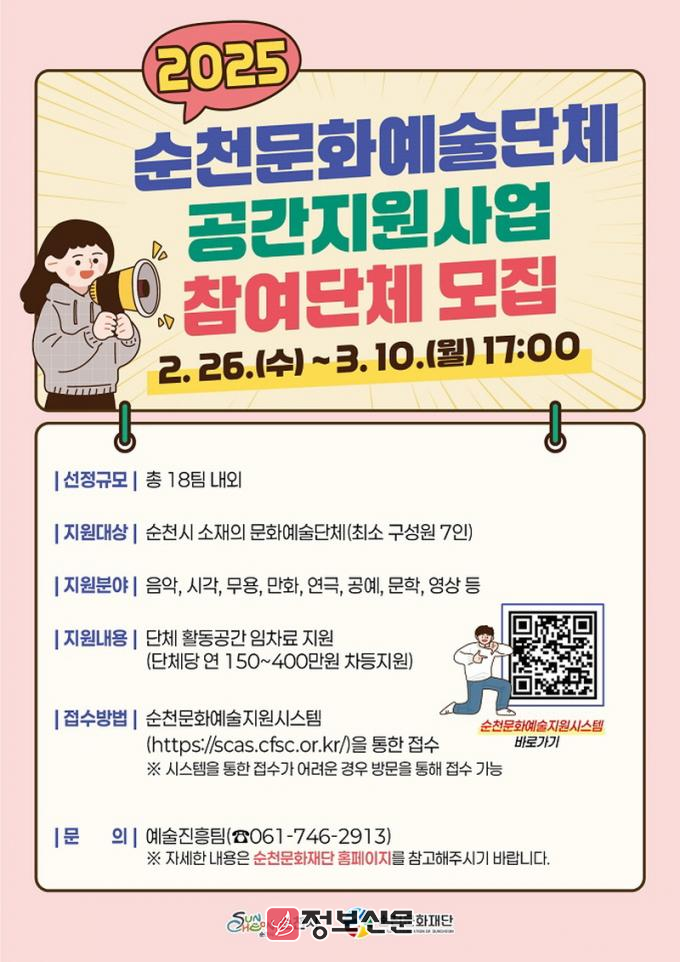 ![]() (재)순천문화재단, 순천 문화예술단체 공간 임차료 지원 |