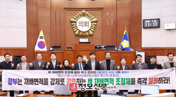 나주시의회는 이번 건의안을 통해 ▲정부는 재배면적을 강제로 감축하는 벼 재배면적 조정제를 즉각 철회할 것과 ▲쌀 생산 농가의 안정적 소득 보전을 위한 지속가능한 농업 정책을 수립할 것을 강력히 촉구했다.