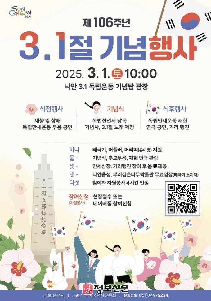 이번 행사는 순국선열의 숭고한 나라 사랑 정신을 계승하고 3.1절 의미를 기념하는 자리로 순천시장을 비롯한 기관·단체장, 유족 등 500여 명이 참석할 예정이다.
