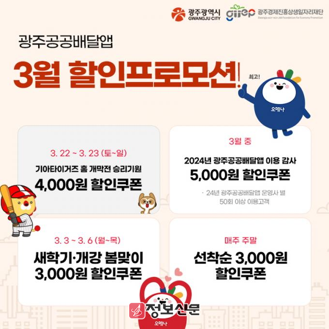 우선 새학기를 맞이해 평일인 3월 3일부터 6일까지 3000원 할인쿠폰을 제공한다. 매주 토‧일요일 제공하는 3000원 주말 할인쿠폰 혜택도 이어가고, 특히 KIA 타이거즈 홈 개막전 기간인 3월 22일과 23일에는 타이거즈의 승리를 기원하며 최대 4000원까지 할인쿠폰을 제공한다. 이에 더해 지난해 광주공공배달앱을 운영사별 50회 이상 이용한 소비자를 대상으로 5000원 감사 쿠폰을 지급할 계획이다.