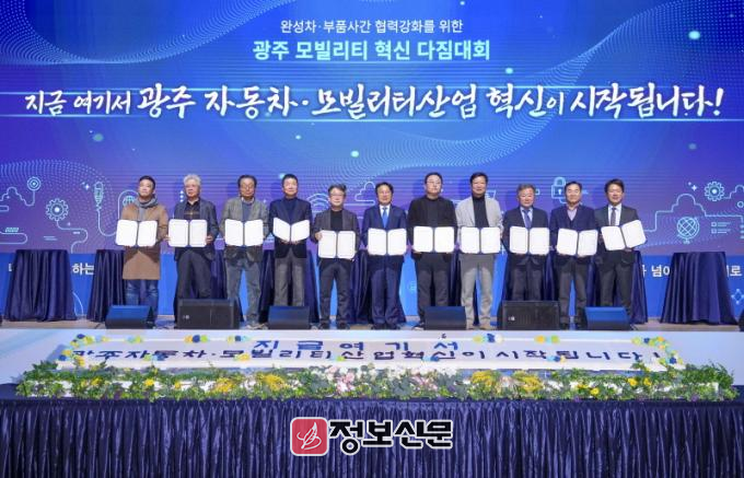 지역 모빌리티산업 발전을 위한 ‘광주 모빌리티 혁신 공동협력 결의서’ 서명식이 진행됐다. 광주시, 기아 오토랜드 광주, 광주글로벌모터스(GGM), 부품기업 6개사, 광주경영자총협회, 광주미래차모빌리티진흥원 등 11개 기업‧기관들이 서명했다.