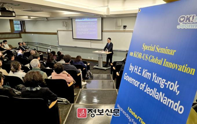 ![]() 미국을 순방중인 김영록 전라남도지사가 26일(현지 시간) 샌프란시스코 스탠퍼드대학교에서 ‘한미 글로벌 혁신, AI시대 도전과 협력의 비전’이란 주제로 특강에 나서 ‘위기의 대한민국과 재도약 비전’, ‘대한민국 재창조를 위한 한·미 경제협력 방안’ 등을 제시하고 있다.