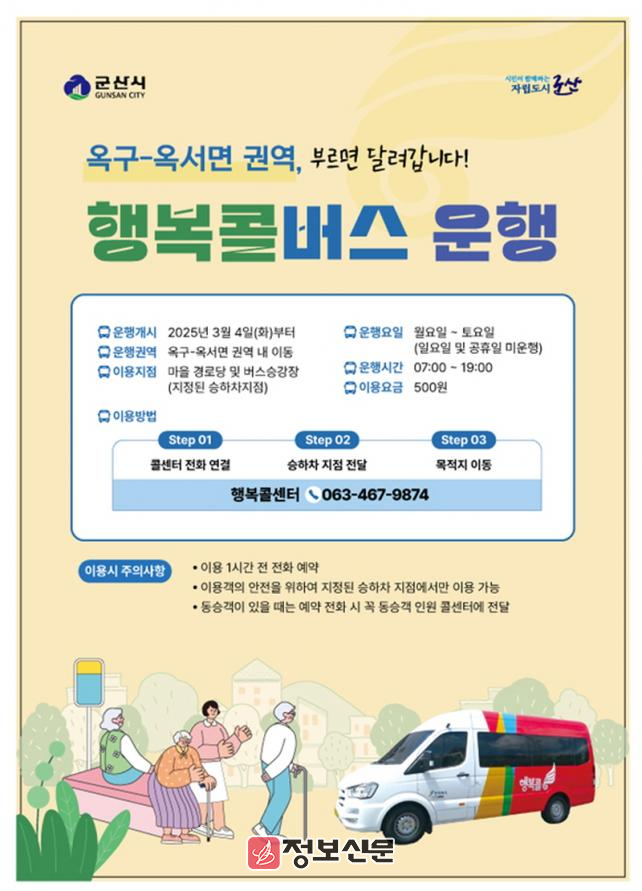 현재 군산시에는 8대의 행복콜버스가 임피·서수면, 회현면, 대야면, 가력항에서 운행하고 있으며, 이번 옥구·옥서면 신규 운행에 따라 5개 권역에서 총 10대의 행복콜버스가 운영된다.
