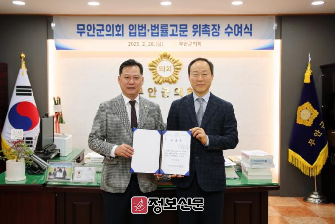 새로 위촉된 입법 고문은 김병도 소장(한국산업기술원 자치법규연구소), 홍봉주 변호사(H&P법률사무소)로 앞으로 무안군의회의 입법 활동 및 법률적 검토를 지원할 예정이다.