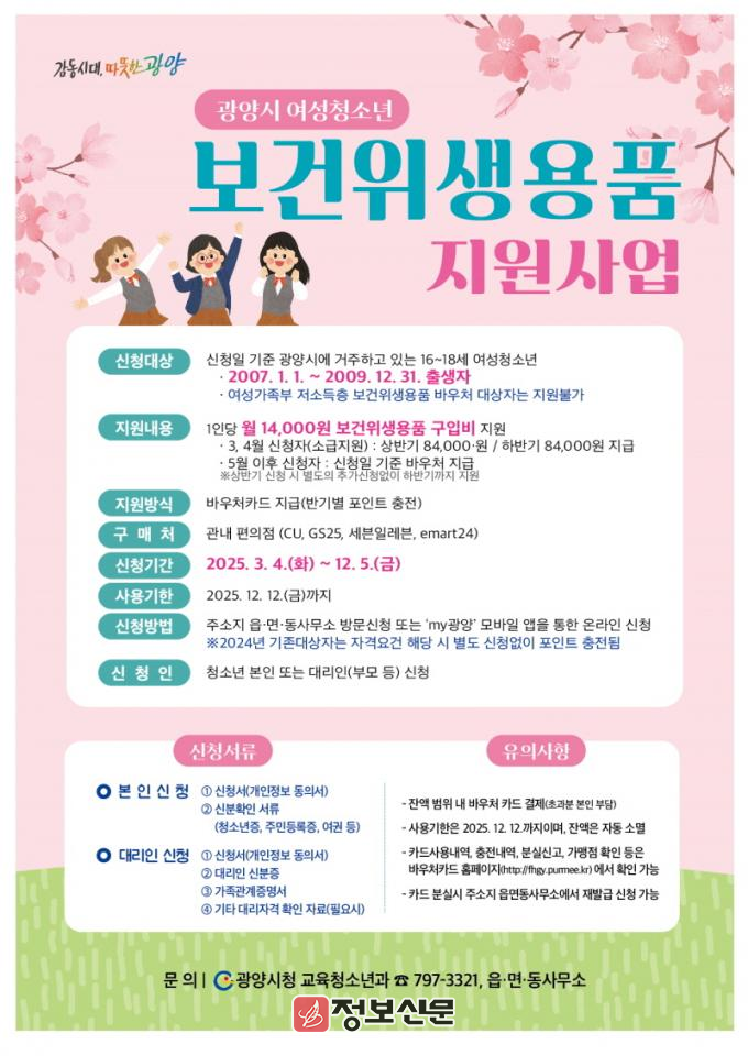 ![]() 광양시, 여성청소년 보건위생용품 구입비 지원 확대 |