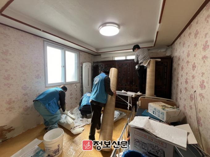 복지기동대는 지원 가구의 안전하고 편안한 주거 환경을 위해 도배 및 장판 교체 작업을 세심하게 진행하며 주택의 분위기를 밝고 깨끗하게 개선했다.