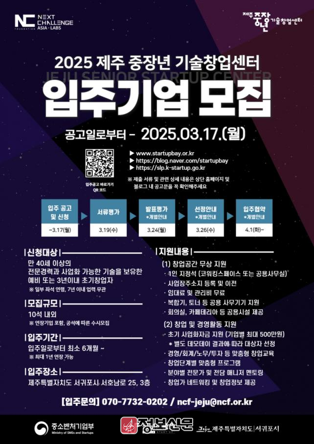 ![]() 서귀포시, 제주 중장년 기술창업센터 2025년 신규 입주기업 모집 |