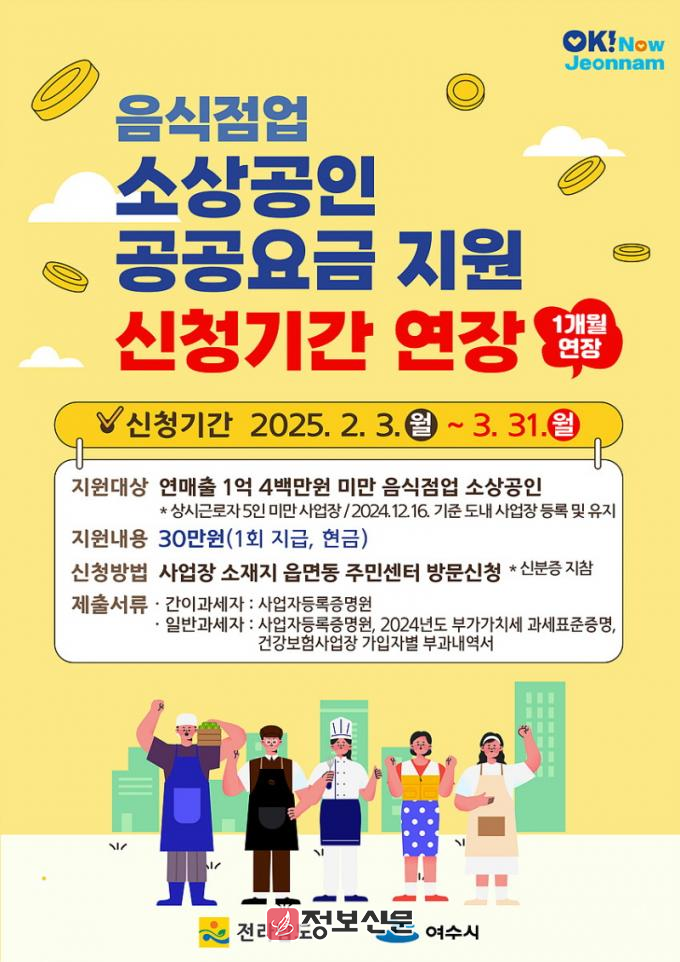 ![]() 여수시(시장 정기명)가 영세 음식점업 소상공인을 대상으로 진행 중인 공공요금 지원사업의 접수 기간을 3월 31일까지 1개월 연장한다. |