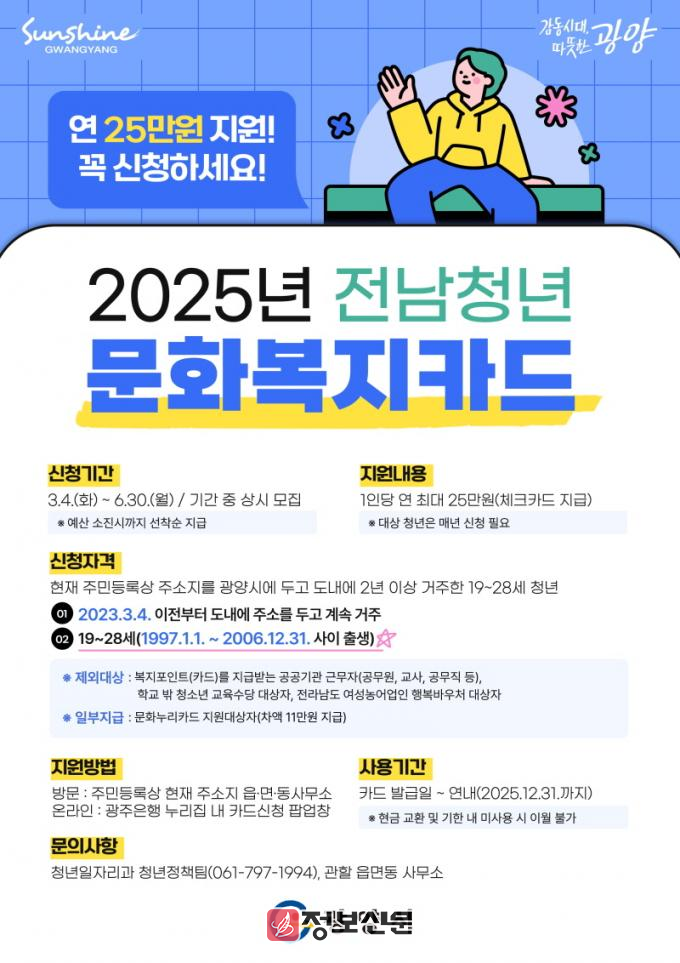 ![]() 광양시, 2025년‘전남청년 문화복지카드’신청․접수 |