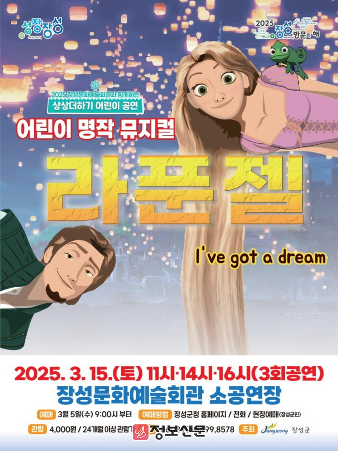 첫 번째 공연은 오는 15일에 열리는 어린이 뮤지컬 ‘라푼젤’이다. 명작동화 ‘라푼젤’을 원작으로 한 작품으로, 라푼젤과 왕자가 흥미진진한 모험을 떠나는 내용이다. 예매는 5일 오전 9시부터 장성군 문화교육과로 전화(061-390-8578, 8599)하거나 누리집에서 접수하면 된다.
