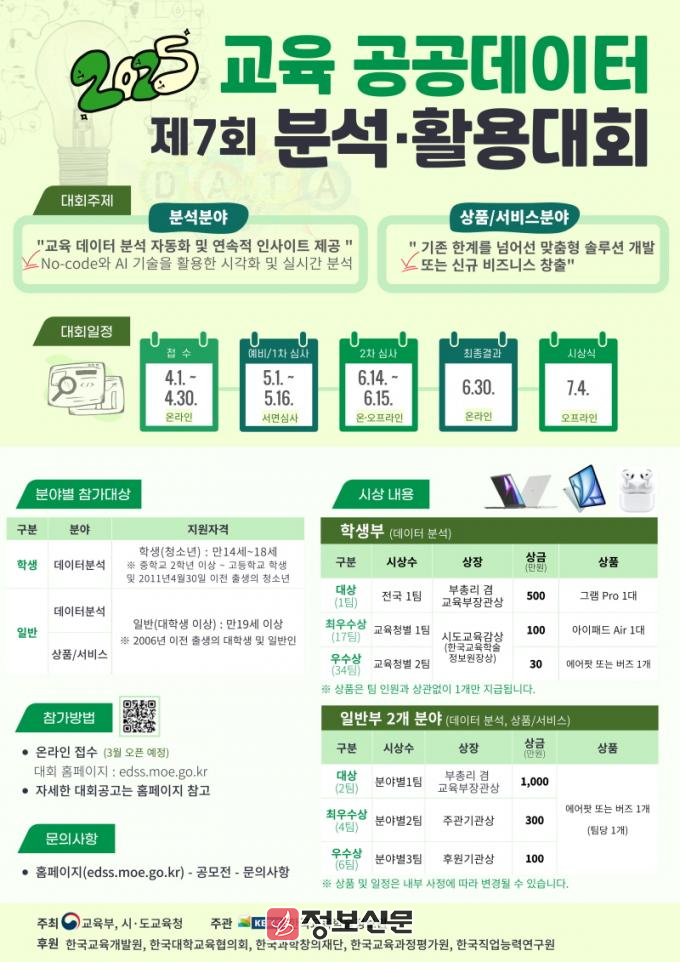 이번 대회는 교육부와 시·도교육청이 공동으로 주최하며, 학생부(데이터 분석), 일반부(데이터 분석, 상품/서비스) 등 2개 분야로 나눠 진행된다.