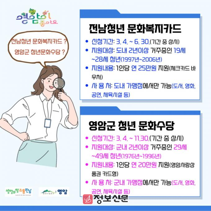 전남 청년문화복지카드 신청은 6월까지로, 2023년 3월 4일 이전부터 전남에 살고 있는 1997~2006년 출생자가 받을 수 있다. 영암군 청년문화수당 신청은 11월까지로, 2023년 3월 4일 이전부터 영암군에 거주한 1976~1996년 출생자가 수령 가능하다.
