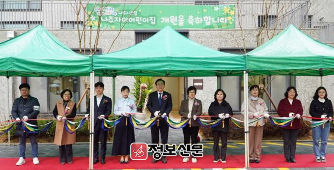 ![]() 나주시가 지난 4일 공립 나주자이어린이집 개원식을 개최했다. 나주자이리버파크아파트 단지 내 총 74명을 수용할 수 있는 387㎡(약 117평) 규모 보육 시설로 0세부터 2세까지 총 15개반을 운영할 계획이다. (사진제공-나주시) |