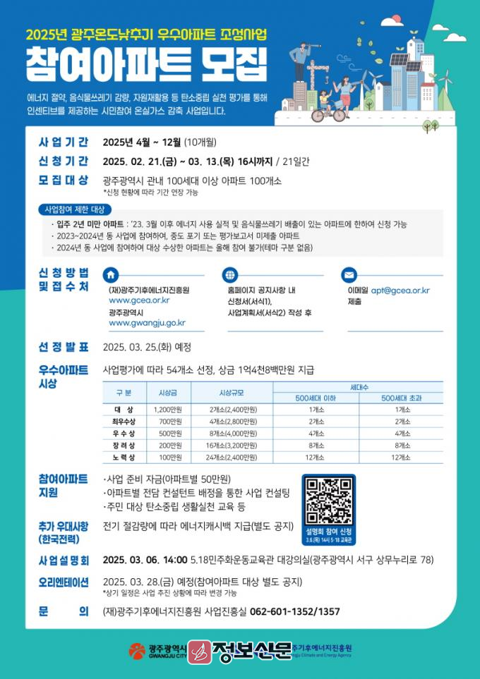 광주광역시(시장 강기정)는 ‘2025년 광주 온도 낮추기 우수아파트 조성사업’에 참여할 아파트 100곳을 모집한다. 이번 사업은 ‘2045탄소중립도시 조성’을 목적으로 온실가스 감축 확산을 위해 추진하는 대표적인 시민 실천 사업이다.