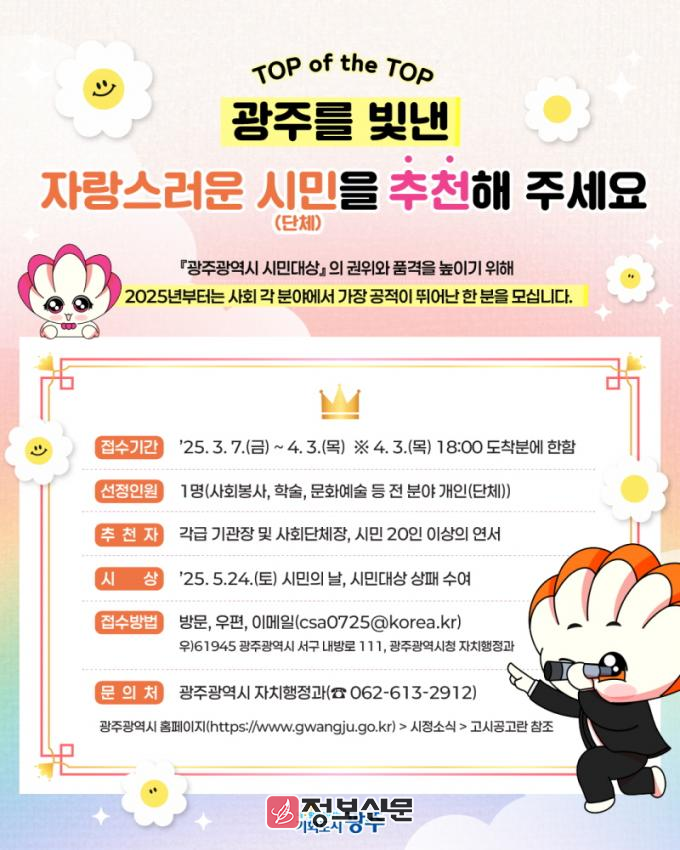 ![]() 광주광역시, 제38회 시민대상 후보자 공개모집 |