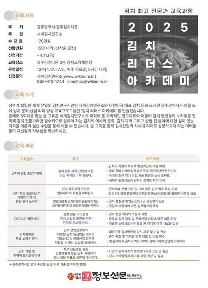 ![]() 광주김치타운, 2025 김치 리더스 아카데미 수강생 모집 |