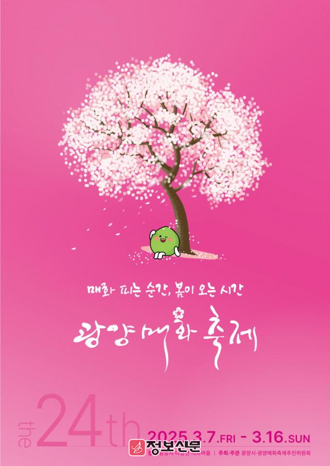 한편, 제24회 광양매화축제는 3월 7일부터 16일까지 ‘한국의 봄, 광양매화마을에서 열다’라는 주제로 열린다. 축제는 ‘매화 피는 순간, 봄이 오는 시간’이라는 슬로건 아래 다양한 축제 콘텐츠와 이색 프로그램이 마련돼 관광객들을 맞이할 예정이다.