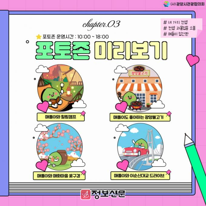포토존은 매돌이와 힐링캠프, 매돌이와 이순신대교 드라이브 등 네 가지 컨셉이 감각적인 소품으로 연출됐다. 방문객은 이곳에서 광양매화축제장에서만 찍을 수 있는 인생 사진을 건질 수 있다.