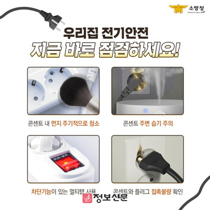 이에 따라 소방서에서는 전기화재 예방을 위해 ▲콘센트 내 먼지 주기적으로 청소 ▲콘센트 주변 습기 주의 ▲차단기능이 있는 멀티탭 사용 ▲문어발식 전기 콘센트 사용금지 ▲사용하지 않을 때는 플러그 뽑기 ▲누전차단기 작동상태 정기 확인 ▲젖은 손으로 콘센트 만지지 않기 등 예방수칙을 안내하고 있다.