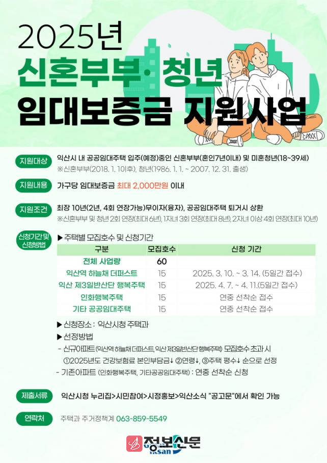 ![]() 익산시, 신혼부부·청년 임대보증금 지원사업 추진 |