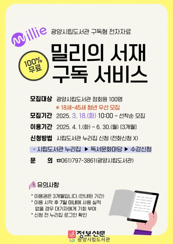 광양시립도서관은 선착순 100명에게 20만 권 이상의 전자책, 오디오북, 매거진 등을 제공하는 국내 최대 전자책 플랫폼인 ‘밀리의 서재’ 3개월 이용권을 제공할 예정이다. 이용 가능 기간은 4월1일부터 6월 30일까지로, 이용권을 등록한 날로부터 3개월이 아닌 안내된 이용 기간까지만 이용할 수 있다.