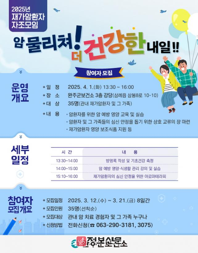 관내 암 치료 경험자 및 그 가족들은 누구나 참여 가능하며, 희망자는 오는 21일까지 완주군보건소(290-3075, 3181)로 신청 접수하면 된다. 참가자는 선착순으로 선정된다.