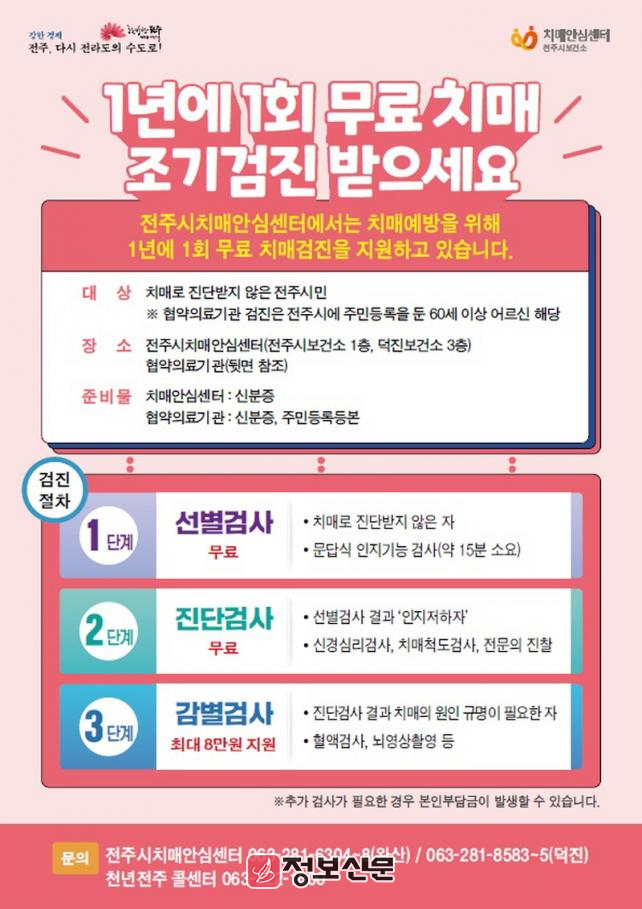 한편, 무료 치매 조기 검진에 대한 자세한 사항은 전주시 치매안심센터 누리집(jeonju.nid.or.kr)을 참고하거나, 전화(063-281-6304~6308)로 문의하시면 안내를 받을 수 있다.