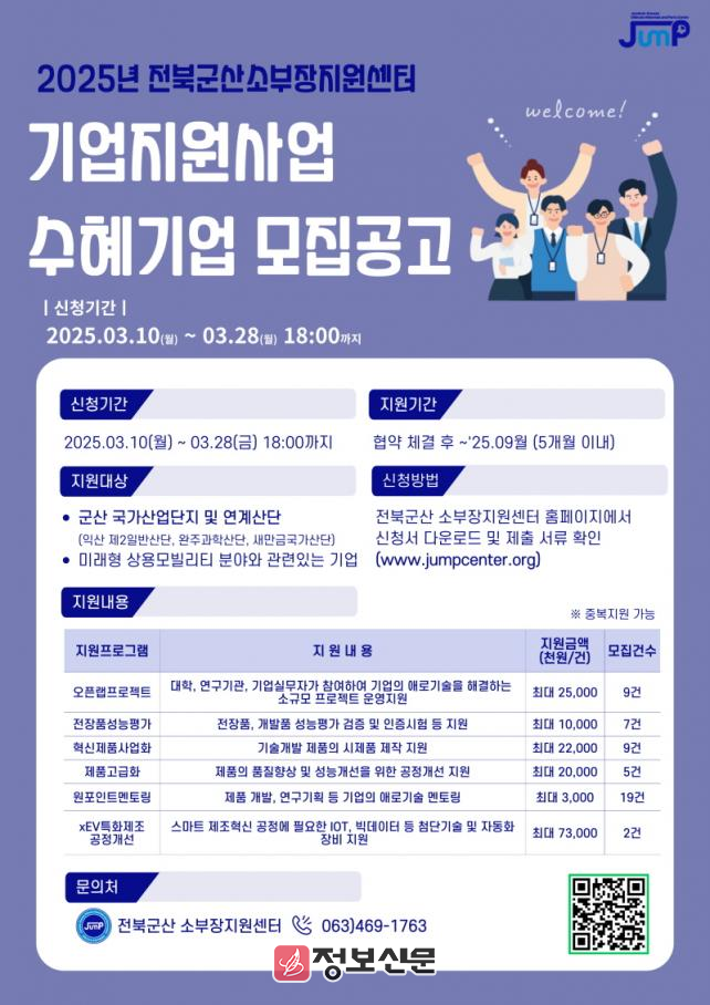 지원을 희망하는 기업은 오는 28일까지 전북군산소부장지원센터 누리집을(www.jumpcenter.org) 통해 상세 지원 항목 및 제출서류를 확인한 후 신청하면 된다. 관련 문의는 군산시 신성장산업과(☎063-454-2762) 또는 전북군산 소부장 지원센터(☎063-469-1763)로 하면 된다.