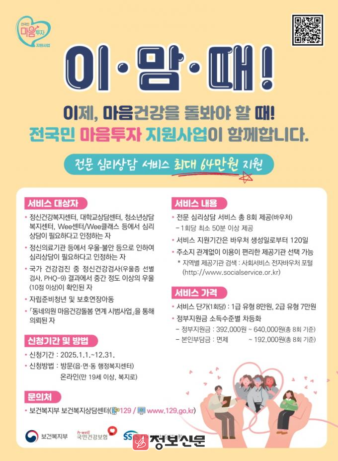 한준호 보건소장은 “앞으로 전 군민이 마음건강을 지킬 수 있도록 보다 접근성 높은 심리상담 지원 체계를 구축해 나갈 것”이라며 “전국민 마음투자 지원사업을 통해 많은 군민이 건강한 마음을 되찾고, 삶의 질을 높이는 계기가 되길 바란다”고 말했다.