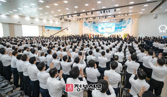기념예배는 ▲창립 41주년 소개 ▲특별영상 ▲신천지예수교회 연혁보고 등의 순으로 진행됐다. 이후 단에 오른 이만희 총회장은 성도들을 향해 성경에 입각한 신앙과 성장을 거듭 당부했다. 이 총회장은 “하나님께서는 우리가 말씀으로 온전하게 창조되기를 원하신다. 나 자신이 이 말씀과 하나 돼야 한다”며 “계시록대로 이뤄진 실체까지 깨달아야 한다. 그래야 내 소원도, 하나님의 소원도 이루는 것”이라고 강조했다.
