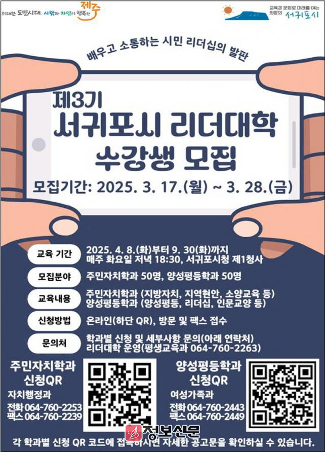 ![]() 서귀포시, 제3기 서귀포시 리더대학 수강생 모집 |