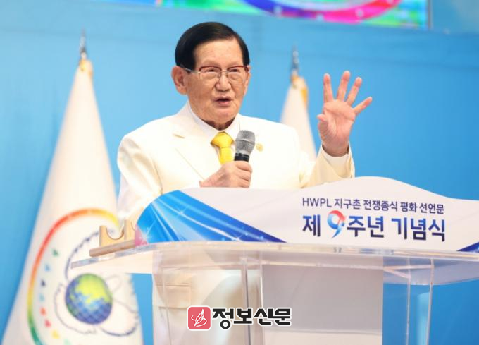 ![]() 14일 충북 청주에서 열린 HWPL 지구촌 전쟁종식 평화선언문 제9주년 기념식에서 이만희 대표가 기념사를 하고 있다 |