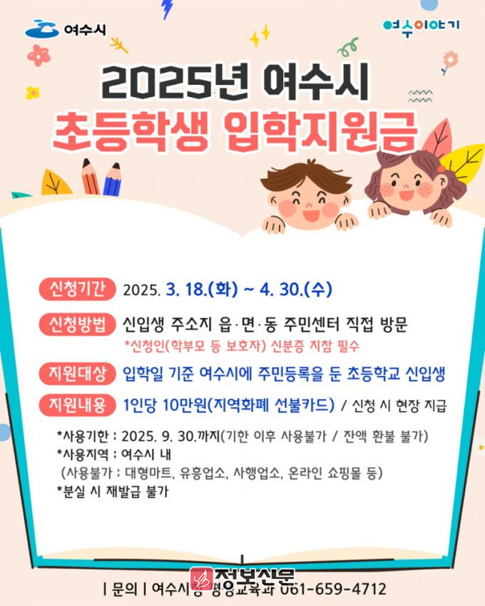 ![]() 여수시, 초등학교 신입생 입학지원금 지원사업 추진 |
