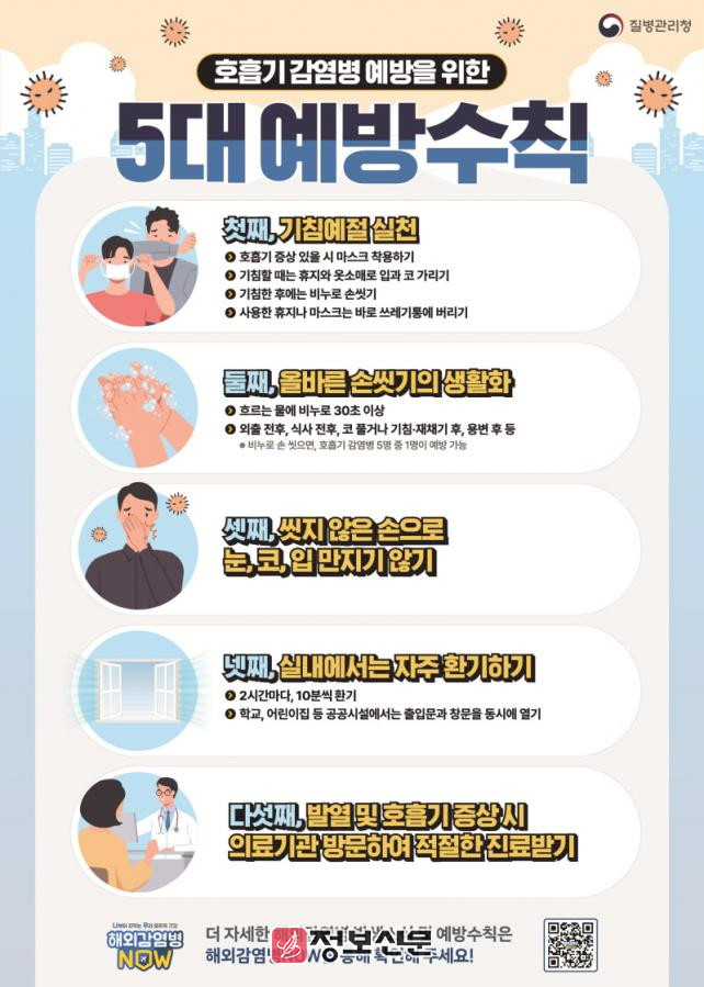 호흡기 감염병 예방을 위한 5대 예방수칙으로는 기침예절 실천, 올바른 손 씻기의 생활화, 씻지 않은 손으로 눈, 코, 입 만지지 않기, 실내에서는 자주 환기하기, 발열 및 호흡기 증상 시 의료기관 방문해 적절한 진료받기가 있다.