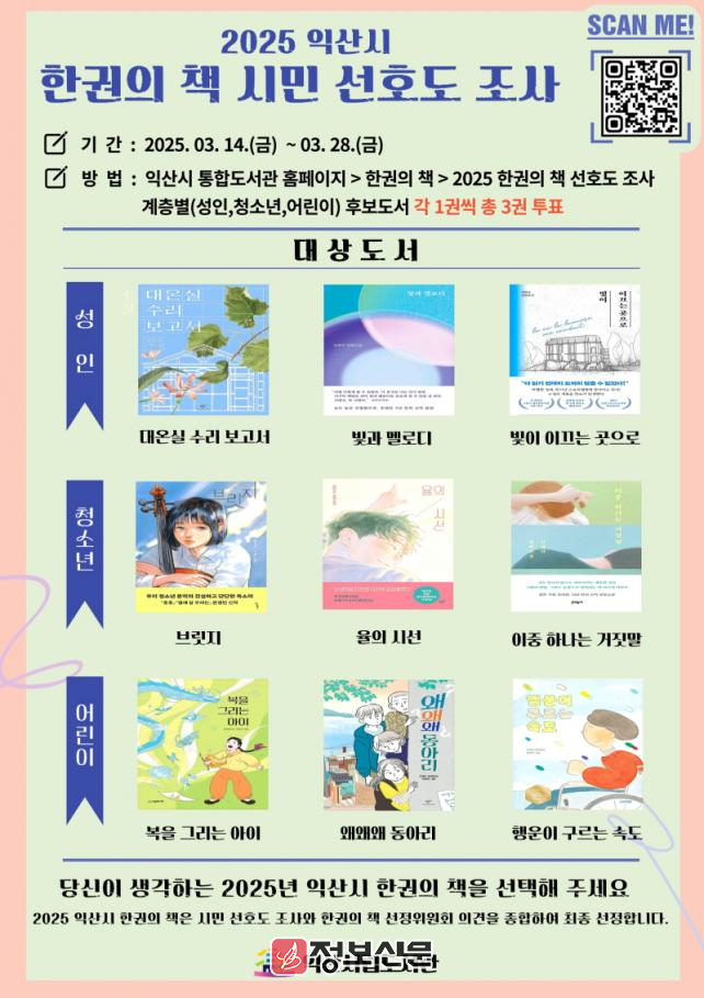 ![]() 익산시, 2025년 한권의 책 선정 시민선호도 조사 진행 |