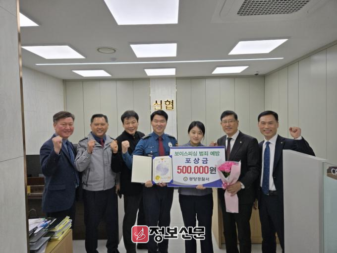 ![]() 광양경찰서, 보이스피싱 피해 예방 광양신협(광양읍점)직원에게 감사장 전달 |