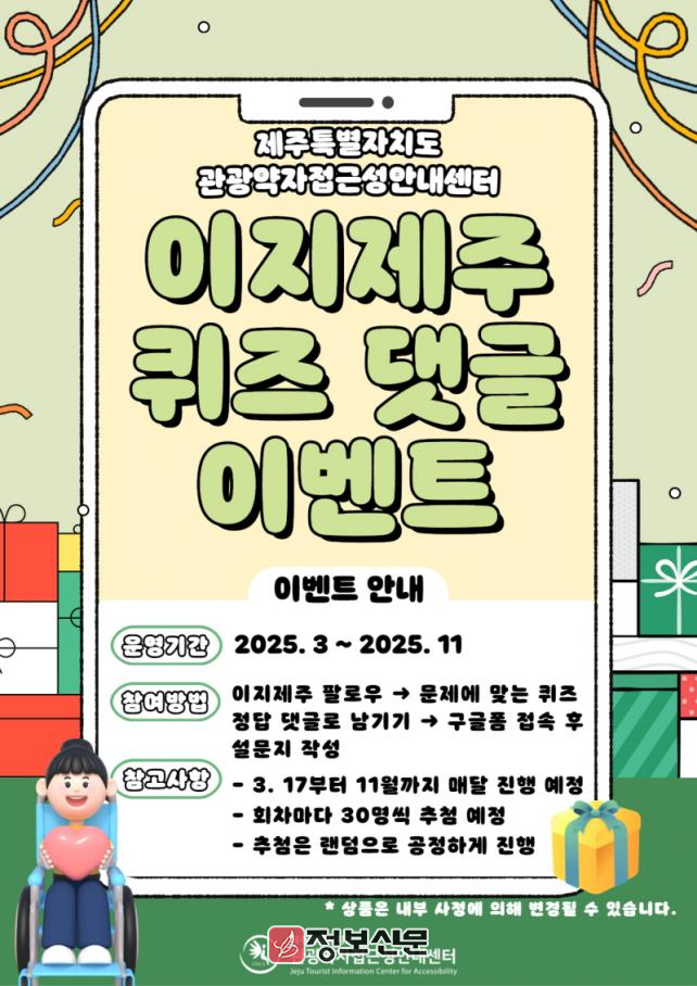 ![]() 제주특별자치도 관광약자접근성안내센터, SNS 퀴즈 댓글 이벤트 진행 |
