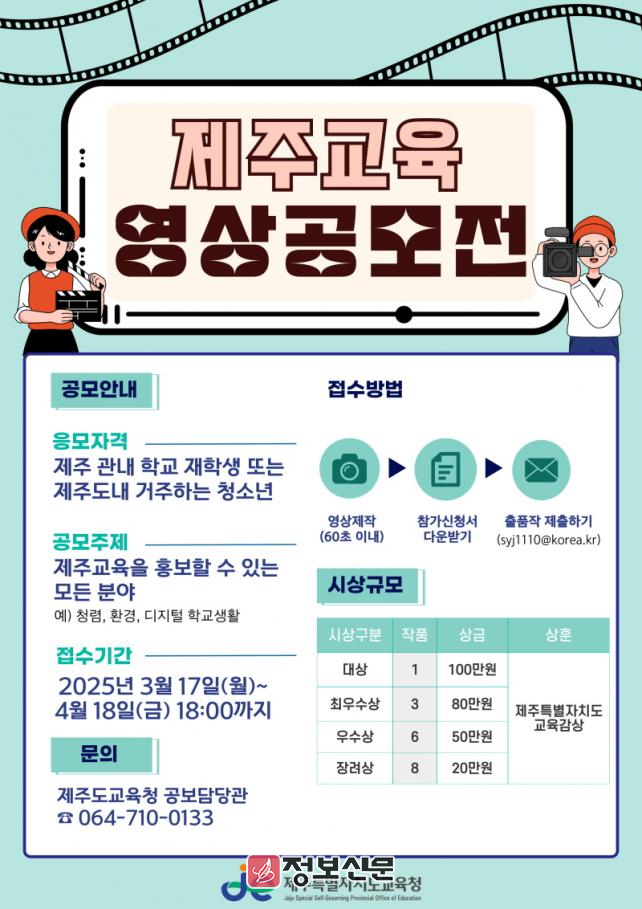 ![]() 제주특별자치도교육청, 2025 제주교육 영상 공모전 개최 |
