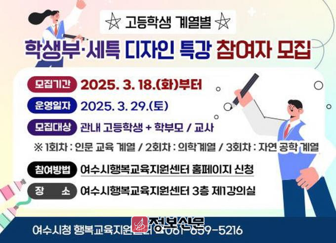 ![]() 여수시, ‘고등학생 계열별 학생부·세특 디자인 특강’ 개최 |