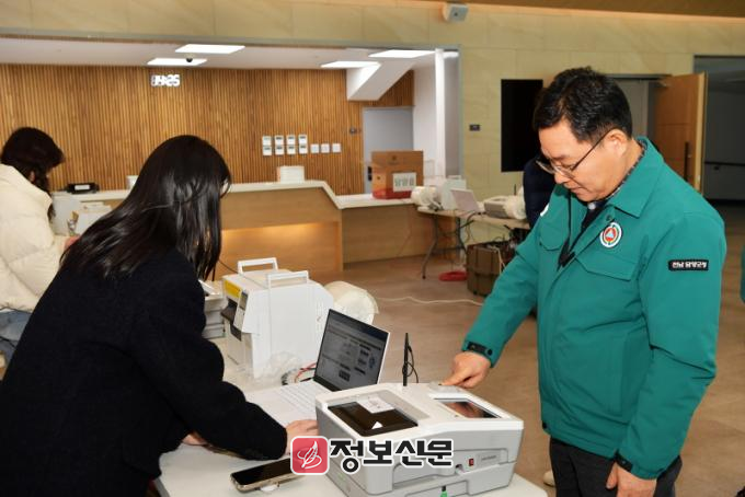 정광선 군수권한대행은 담양읍 사전투표 모의시험 장소를 방문해 준비 상황을 확인하며 직원을 격려하는 한편 “장비의 운용 요령과 절차 등을 정확하게 숙지해 차질 없이 사전투표를 진행할 수 있도록 준비해 주길 바란다”라고 당부했다.