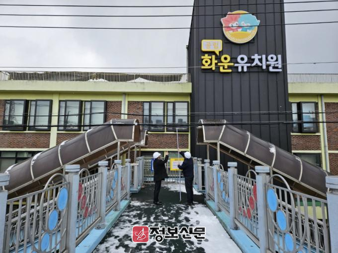 ![]() 광주 화운유치원 앞 육교에서 전선과 육교 거리를 측정하고 있는 시교육청 직원들