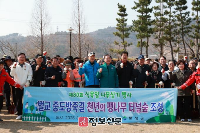 이날 행사에는 김철우 보성군수, 김경열 보성군의회 의장과 군의원, 이동현 도의원, 김길두 벌교읍민회장, 벌교이장단협의회 등 지역 기관·단체 관계자, 학생, 주민, 공무원 등 600여 명이 참석해 벌교읍 중도방죽 2.4km 산책로에 팽나무 290그루를 심었다.