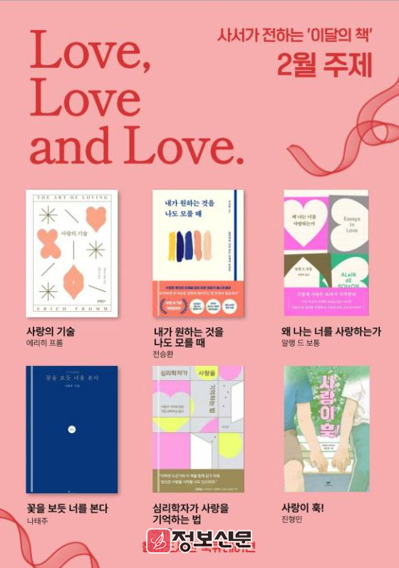 지난 2월의 주제는 ‘러브, 러브, 그리고 러브(LOVE, LOVE AND LOVE)’로 에리히 프롬의 <사랑의 기술> 등 가족, 연인들 간의 사랑에 관한 책 12권을 선정했고, 3월에는 ‘봄, 반짝반짝’이란 주제로 새로운 시작을 준비하는 사람들에게 힘을 줄 수 있는 책인 코리 도어펠드의 <가만히 들어주었어> 등 12권을 선정해 소개하고 있다.