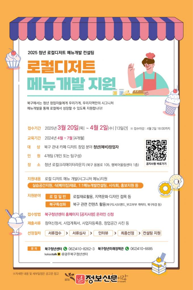 로컬 일반 분야는 디저트 개발 시 광주·전남에서 나는 재료를 사용하거나 지역의 문화를 접목한 아이디어 전반을 대상으로 하고 북구 특성화 분야는 북구의 도시브랜드 및 캐릭터(부끄&부부) 등을 활용한 메뉴를 지원한다.