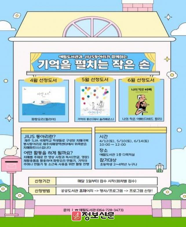 김봉석 탐라도서관장은 “어린이들이 치매에 대한 올바른 이해를 넓혀가는 소중한 시간이 될 것”이라며, “시민들의 많은 참여를 바란다”고 말했다.